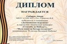 "Спасибо за Победу!", "Яуда җиңгән батыр солдатка!" Бөек Җиңүнең 70 еллыгына багышланган шәһәр конкурсына нәтиҗәләр ясалды. 6 нчы "а" сыйныфы укучысы Сабиров Айнур (җитәкчесе Сабирова Ф.В.) "Дымковская игрушка" номининациясендә җиңеп, диплом белән бүләкләнде.