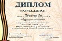 "Спасибо за Победу!", "Яуда җиңгән батыр солдатка!" Бөек Җиңүнең 70 еллыгына багышланган шәһәр конкурсына нәтиҗәләр ясалды. 6 нчы "в" сыйныфы укучысы Мингалеева Лия (җитәкчесе Сабирова Ф.В.) "Вязаное изделие" номининациясендә җиңеп, диплом белән бүләкләнде. Уңышлар телибез!