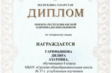 Поздравляем ученицу 8А класса Гарифьянову Диляру Азатовну призера Республиканской олипиады школьников по татарскому языку. Желаем дальнейших успехов!!!