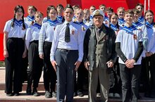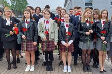 Учащиеся 10п класса "СОШ37" у мемориала "Родина-Мать" на праздничном параде, посвящённом Дню Победы.