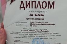 Поздравляем Гусеву Екатерину, ученицу 6г класса с победой в муниципальном конкурсе рисунков «Славься в веках наша Победа!», посвящённом 76 годовщине Великой Победы советского народа в Великой Отечественной войне, среди юнармейских отрядов города в рамках ВВПОД «Юнармия РТ» городской военно- патриотической программы «Звезда»