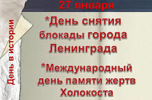 27 января в России отмечается День полного освобождения Ленинграда от фашистской блокады (1944 год). Эта же дата установлена ООН как Международный день памяти жертв Холокоста, приуроченный к освобождению советскими войсками концлагеря Освенцим в 1945 году. Это день памяти двух трагедий, символизирующих борьбу с нацизмом.