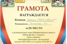 17 декабря на базе нашей школы проводился муниципальный этап Всероссийских соревнований по мини-футболу (футзалу) среди команд общеобразовательных организаций в рамках Общероссийского проекта «Мини-футбол – в школу среди юношей 2001-2002 г.р. В рамках данного спортивного соревнования юноши нашей школы заняли почетное 3 место.