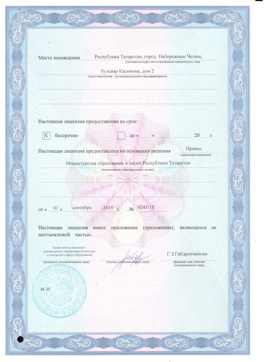 Лицензия на право ведения образовательной деятельности (страница 1, страница 2) с приложением