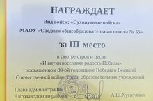 Учащиеся 8 Б класса нашей школы приняли участие в смотре строя и песни “И внуки восславят радость Победы”, посвященном 80- ой годовщине Победы в Великой Отечественной войне, среди образовательных учреждений города Набережные Челны. Наши ребята заняли почетное 3 место среди всех команд города.