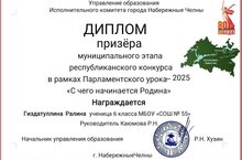 В рамках Парламентского урока- 2025 года учащиеся нашей школы приняли участие в республиканском конкурсе “С чего начинается Родина?” Ученица 6 класса Гиздатуллина Ралина стала призером данного конкурса. Поздравляем Ралину и руководителя Каюмову Р.Н.