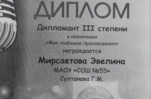 Рус теле һәм әдәбияты укытучысы Солтанова Гүзәл Мирзанур кызы җитәкчелегендә мәктәп укучылары “Искусство звучащего слова” исемле региональ әдәби уку конкурсында катнаштылар. 8 Г сыйныфы укучысы Мирсаетова Эвелина - 3 нче дәрәҗәле диплом алды. Җиңүчеләрне тәбрик итәбез.