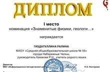 Мәктәп укучылары “Гасырлар кайтавызы” исемле фәнни эшләр буенча региональ конкурста катнашты. Гиздатуллина Ралина “ Танылган физиклар, геологлар, телчеләр....” исемле номинациядә җиңеп, 1 нче дәрәҗәле диплом алды. Ралинаны һәм татар теле укытучысын Каюмова Р.Н. котлыйбыз.