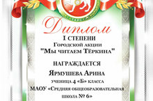 С 18.04 по 12.05.2016 года в Городском дворце творчества детей и молодежи № 1 проходила Городская акция «Мы читаем Тёркина», приуроченная ко дню Победы. Чтобы принять участие в данной акции, нужно было снять видеоролик со своим выступлением и разместить на странице в контакте «Городская акция «Мы читаем Тёркина». 15 мая были определены победители. 1 место заняла ученица 4Б класса Ярмушева Арина (рук. Кузина Н.Л.), 3 место было присуждено Низамутдиновой Руслане, ученице 8Б класса (рук. Долгова Е.Б. и Белоусова Р.М.). Молодцы!