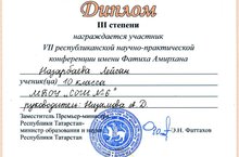 16 марта в школе №170 Ново-Савиновского района г. Казани прошла НПК имени Фатиха Амирхана. VII Республиканская научно-практическая Конференция имени Ф. Амирхана проходит в год празднования юбилеев классиков татарской литературы Мусы Джалиля и Габдуллы Тукая, оказавших огромное влияние на развитие тюркоязычных литератур, и подготовки к Международному году родных языков. Ученица 10А класса Назарбаева Лейсан (рук. Низамова А.Д.) успешно выступила в секции «Творческое наследие Фатиха Амирхана» и заняла 3 место. Поздравляем!
