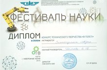 18 марта в Набережночелнинском филиале КНИТУ-КАИ состоялся Фестиваль науки. В рамках Фестиваля были проведены научно-популярные игры и конкурсы, напучные квесты и стенд-апы, мастер-классы и практикумы. В конкурсе технического творчества «В полёт!» команда старшеклассников: Зиннатуллин Айдар, Муксинова Рамзия и Фирстов Никита (рук. Долгова Е.Б.) заняли 3 место. Успехам Вам в освоении научных знаний!