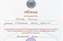 Подведены итоги IV Всероссийского дистанционного конкурса «Умка» среди учащихся начальных классов общеобразовательных учреждений по предмету «английский язык». Учащиеся Чичиланова Ева (4А класс) и Дикова Диана (4А класс) награждены дипломом II степени, Нургатин Альберт (4А класс) и Файзуллина Аделина (3Б класс) дипломом III степени (педагог Марсалова А.Н.). Поздравляем!!!
