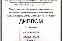 Поздравляем Андреева Илью, ученика 1Б класса, за 3 место в Открытой российской математической Интернет - олимпиаде для школьников, проведённой Кафедрой физико-математического образования Санкт-Петербургской академии постдипломного педагогического образования
