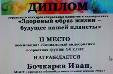 Ученик 5а класса Бочкарев Иван занял II место в городском конкурсе социальных плакатов и видеороликов " Здоровый образ жизни- будущее нашей планеты " в номинации: " Социальный видеоролик " возрастная группа: 5-6 классы.