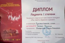 В преддверии 72-ой годовщины Великой Победы, 3 мая, в Парке Победы Автограда состоялся гала-концерт творческого фестиваля-конкурса «Мы память бережно храним», где выступила Середа Варвара, ученица 5 класса и была удостоена Дипломом Лауреата 1 степени.