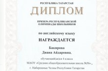 Призером Республиканской олимпиады по английскому языку стала ученица 4 классса Бакирова Диана.