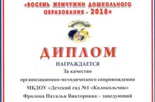 Педагоги ДОУ приняли участие в V Федеральном научно-общественном конкурсе "Восемь жемчужин дошкольного образования - 2018" и были награждены Дипломом за качество организационно-методического сопровождения. Поздравляем!!!