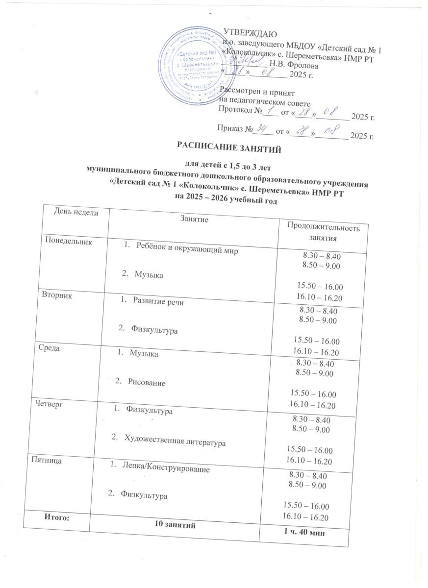 Расписание занятий для детей с 1,5 до 3 лет на 2025-2026 учебный год