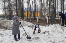 Старшие школьники рыхлят снег, убирают ветки и мусор, младшие - подметают территорию памятника.