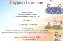 Сегодня наш воспитанник Суворов Савелий награжден Дипломом Лауреата I степени за участие муниципальном конкурсе «Бэхетле балачак» за чтение художественного произведения. Поздравляем и желаем творческих успехов!