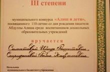 Муниципальный конкурс для воспитанников ДОУ «Алиш и дети», посвященный 110-летию со дня рождения писателя Абдуллы Алиша. Педагоги Саматова И.Р., Спиридонова Р.Х. – Диплом III степени в номинации «Инсценировка произведения»; Алешина А.В. и Кабанова Дарья – Диплом III степени в номинации «Рисунок, выполненный с помощью педагога или родителя»; Габдрахманова З.М. и Сабирова Амелия – Диплом I степени в номинации «Рисунок, выполненный воспитанником». Поздравляем!!! 14.02.2018