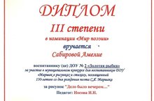 Муниципальный конкурс для воспитанников ДОУ "Маршак в рисунках и стихах", посвященный 130-летию со дня рождения поэта С.Я.Маршака. Воспитанница подготовительной к школе группы №10 Сабирова Амелия и педагог Носова М.Н. награждены Дипломом III степени в номинации "Мир поэзии". Поздравляем! 30.11.2017