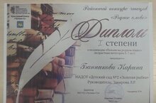 Районный конкурс чтецов «Родное слово» , посвященный Году национальных культур и традиций в РТ :- Банникова Карина и Закирова Л.Р. – Диплом I степени в номинации «Поэзия на родном языке» (возрастная категория 5-7 лет); - Хасанова Азалия и Акатьева Е.В. – Диплом I степени в номинации «Поэзия на родном языке» (возрастная категория 5-7 лет); - Титова Виктория и Акатьева Е.В., Носова М.Н. – Диплом I степени в номинации «Поэзия на родном языке» (возрастная категория 5-7 лет); - Васин Владислав и Акатьева Е.В., Носова М.Н. – Диплом II степени в номинации «Поэзия на родном языке» (возрастная категория 5-7 лет); - Махмутов Марк и Романова О.Е. – Диплом II степени в номинации «Поэзия на родном языке» (возрастная категория 5-7 лет); - Османов Эмир и Акатьева Е.В., Носова М.Н. – Диплом III степени в номинации «Поэзия на родном языке» (возрастная категория 5-7 лет); - Нуруллина Виталина и Акатьева Е.В. – Диплом III степени в номинации «Поэзия на родном языке» (возрастная категория 5-7 лет); - Заболонская Полина и Алешина А.В. – Диплом III степени в номинации «Басня на родном языке» (возрастная категория 5-7 лет) 21.04.2023