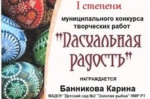 Муниципальный конкурс творческих работ «Пасхальная радость»: Абзалов Радмир и Енизеркина Л.Н. – Диплом II степени в номинации «Пасхальная открытка»; - Банникова Карина и Енизеркина Л.Н.– Диплом I степени в номинации «Пасхальная открытка»; - Сафина Милана и Енизеркина Л.Н. – Диплом III степени в номинации «Пасхальная поделка»; - Абдрахманова Регина и Муравьева С.А. – Диплом III степени в номинации «Пасхальная поделка»; - Иванов Андрей и Акатьева Е.В. – Диплом I степени в номинации «Пасхальная поделка»; - Акатьева Е.В. – Диплом I степени в номинации «Пасхальная поделка»; - Титова Виктория и Акатьева Е.В. – Диплом III степени в номинации «Пасхальный кулич»; - Нуруллина Виталина и Акатьева Е.В. – Диплом III степени в номинации «Пасхальный кулич». 28.04.2022