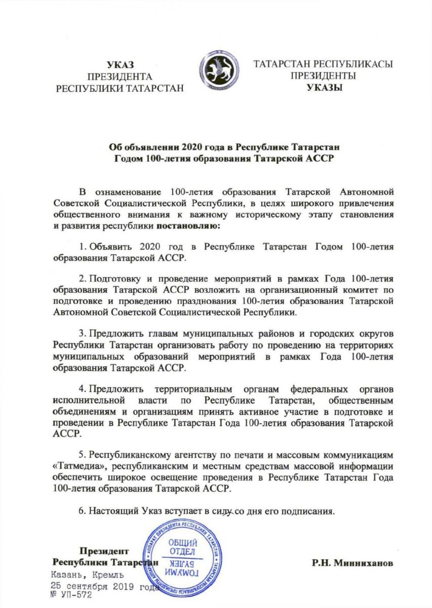 Указом Президента Республики Татарстан от 25 сентября 2019 года № УП-572 в ознаменование 100-летия образования Татарской Автономной Советской Социалистической Республики, в целях широкого привлечения общественного внимания к важному историческому этапу становления и развития республики 2020 год в Республике Татарстан объявлен годом 100-летия образования Татарской АССР.