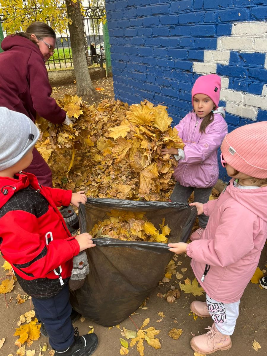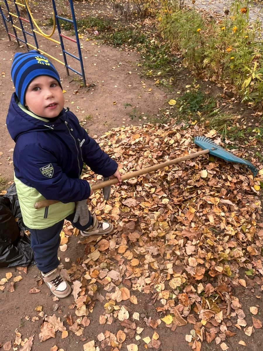 Ребята любят помогать воспитателям в уборке игрового участка. Вот и сегодня они вместе с воспитателями убирали опавшие листья. В работе старательно использовали имеющиеся трудовые навыки. В процессе таких трудовых поручений у детей формируется интерес к труду в природе, экологическое сознание. В работе воспитывается ответственность за порученное дело, трудолюбие.