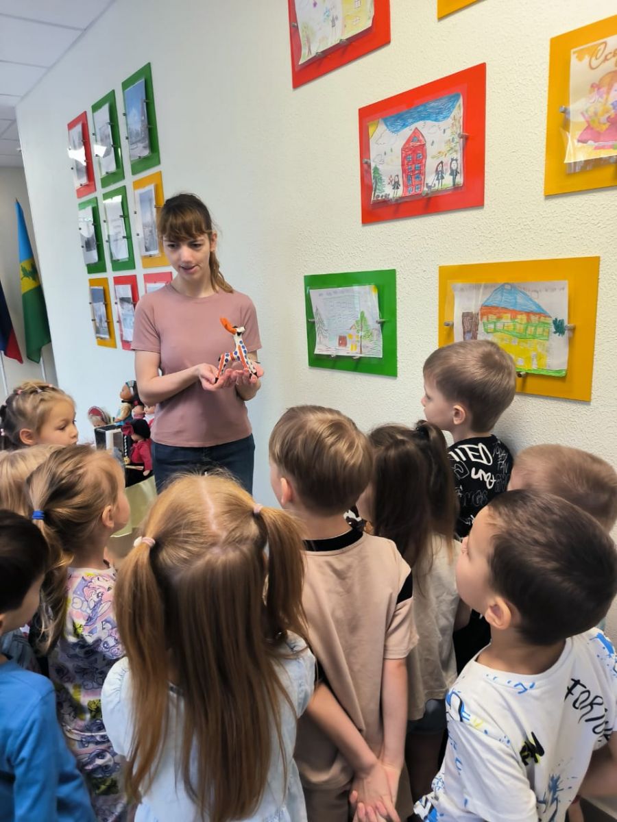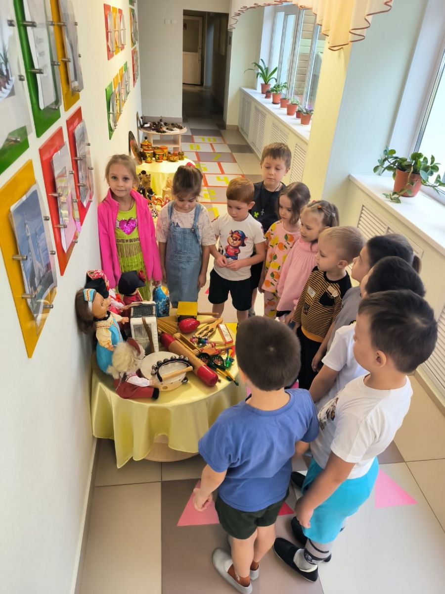 Опубликовано: 10.11.2025В детском саду проходит выставка «Народной русской культуры», на которой представлены образцы дымковской игрушки, музыкальных инструментов, нарядов и т.д. Дети с восхищением рассматривают изделия народного творчества.