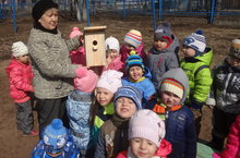 Папа Костюченко Насти из группы №3 сделал нам замечательный скворечник, который мы сегодня подарили птицам.