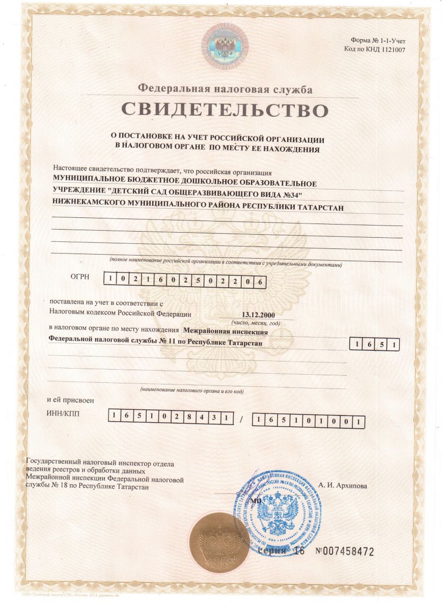 Свидетельство о постановке на учет российской организации в налоговом органе по месту ее нахождения
