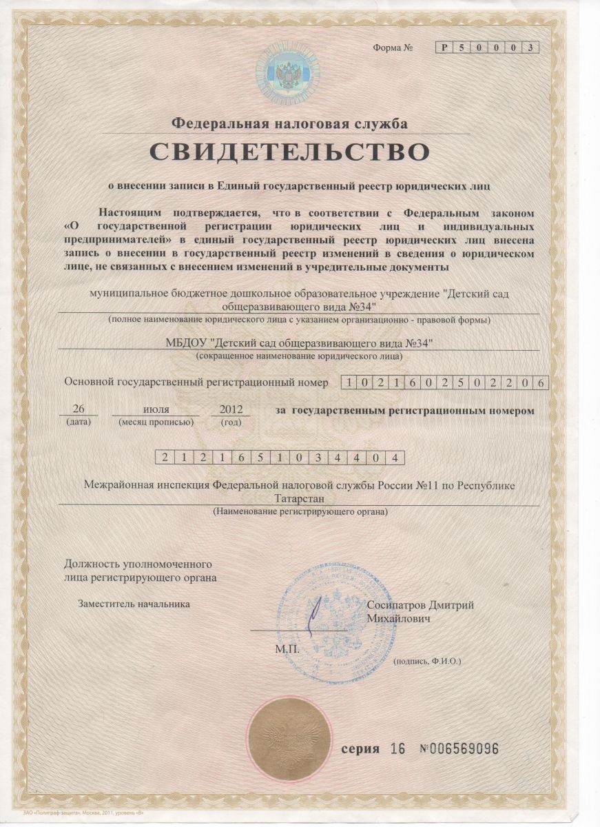 Свидетельство о внесении записи в Единый государственный реестр юридических лиц
