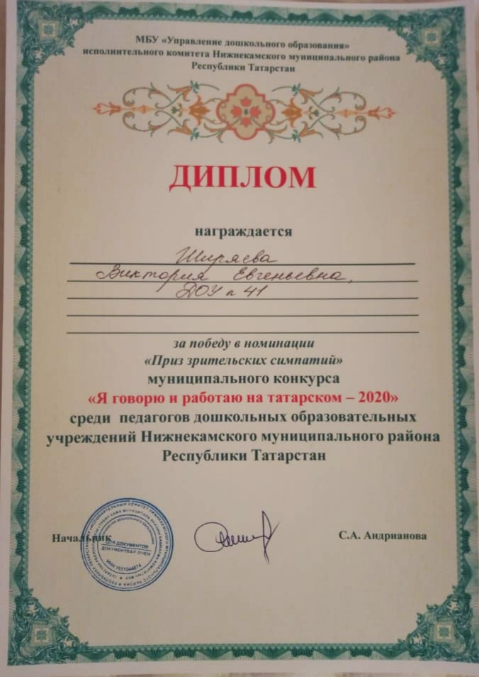 Опубликовано: 13.11.2020Вчера достойно выступила в финале муниципального конкурса "Я говорю и работаю на татарском - 2020" среди педагогов ДОУ НМР РТ воспитатель Ширяева В.Е.. Поздрвляем!!!