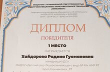 Заведующий нашего детского сада поделилась опытом работы и награждена Дипломом победителя 1 – место Республиканском конкурсе «Культура –наше достояние» «Мәдәният – безнең байлыгыбыз» в номинации Творческая мастерская. Тема: “Вакыт ага-рух кала”. Мы всем коллективом поздравляем и желаем творческих успехов!!!