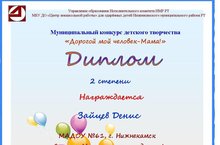 Подведены итоги конкурса, организованного МБУ ДО "Центром внешкольной работы" для одаренных детей Нижнекамского муниципального района РТ . Наш сад был представлен в секции "Мама мир мне подарила" работами воспитанников средней и старшей групп - Дмитриевой Аделины (воспитанницы средней группы № 7), Чарыева Карима, Бариева Ильмира, Зайцева Дениса, Ефремовой Киры (воспитанников старшей группы № 9). Поздравляем Зайцева Дениса с Дипломом II степени. Так держать!