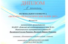 20 октября 2017 года на базе МАДОУ «Центр развития ребенка – детский сад № 91» НМР РТ состоялся очный этап регионального конкурса «Ярмарка педагогических идей-2017». Всего для участия в конкурсе было подано 143 заявки. В финале конкурса на очном этапе приняли участие всего 75 педагогов. Наш детский сад представляли музыкальные руководители Иксанова Марина Ревалевна и Валитова Гузелия Ризаевна с методическим пособием «От игры к творчеству». Они заняли 3 - место. Поздравляем!