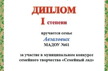На базе МБДОУ №25 прошел конкурс семейного творчества "Семейный лад". Основная цель конкурса - развитие творческого потенциала семьи в национальных и культурных тарадициях. В конкурсе принимали участие семейные коллективы, представляющие национальную культуру своей семьи. Наш детский сад представляла семья Авзаловых Семья Авзаловых была награждена Дипломом I степени. Поздравляем и благодарим Вас за участие!
