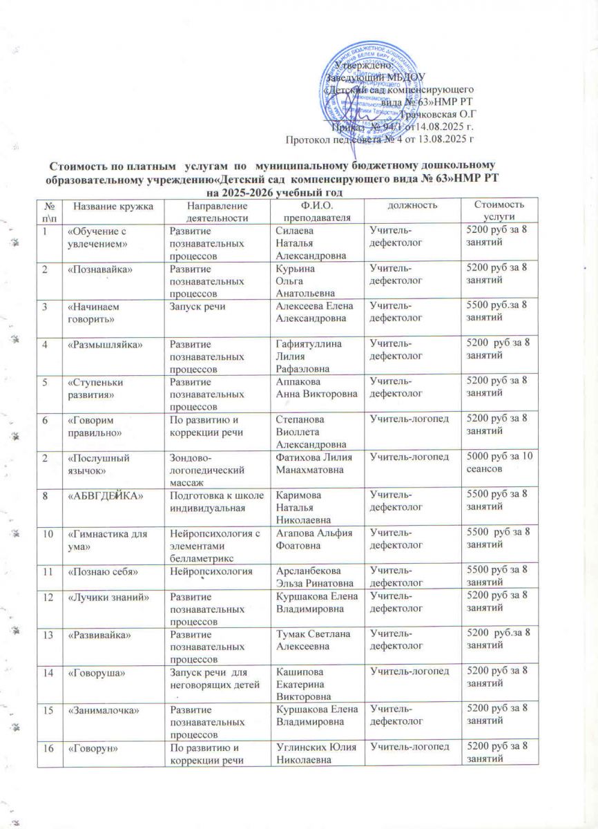 Перечень услуг по платным занятиям на 2025-2026 уч.год