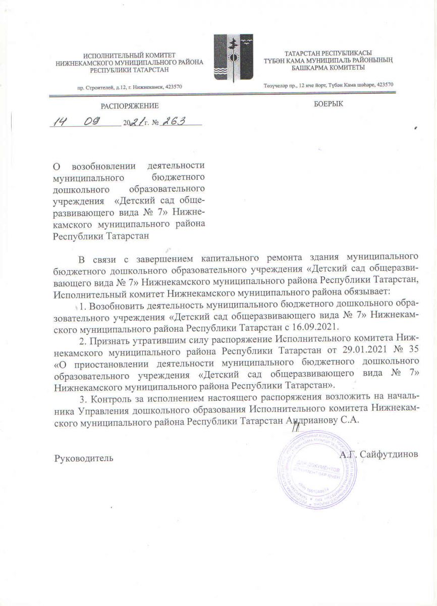 Короткое название: | МБДОУ «Детский сад присмотра и оздоровления для детей с заболеваниями органов дыхания №7» НМР РТ |