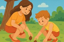 - Игра «Найди и покажись» развивает внимательность и знание окружающей среды. Ребята ищут определённые предметы (шишки, цветы и т.д.) и описывают их. Игра подойдёт для детей разных возрастов и поможет развить наблюдательность, память и речь;