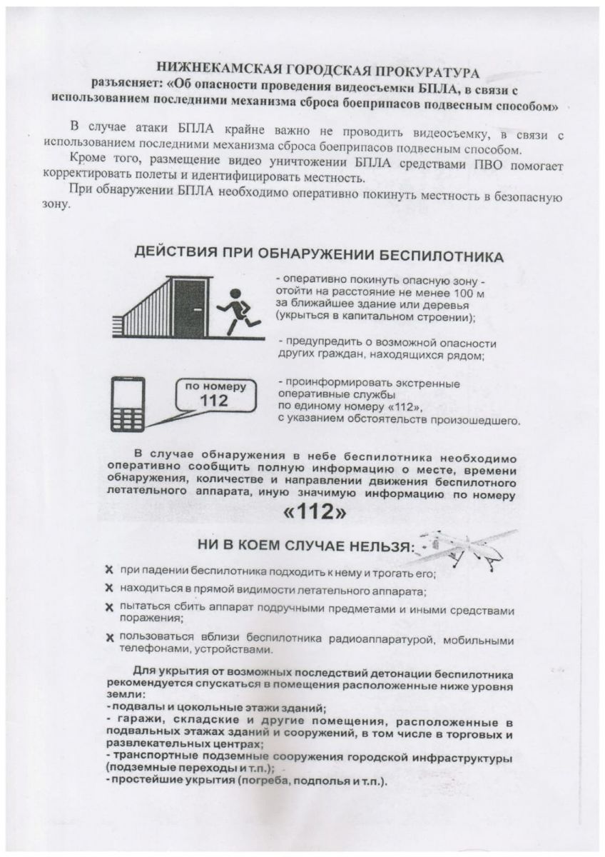 Опубликовано: 23.05.2025Нижнекамская городская прокуратура разъясняет: "Об опасности проведения видеосъемки БПЛА, в связи с использованием последними механизма сброса боеприпасов подвесным способом"