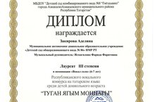 - Закирову Аделину - Лауреата III степени Республиканского вокального конкурса "Туган ягым моңнары".