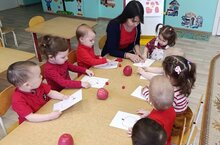 Детишки 11 группы очень любят рисовать, особенно гуашью. Сегодня малыши вместе с воспитателем рисовали солнышко. Самига Минзакировна показала детям приёмы рисования круга кистью и закрашивания. Так же малыши закрепили название цвета жёлтый и геометрическую фигуру круг