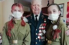 Ученицы 8 б Хаярова Лиана и Козьмодемьянская Диана поздравили ветеранов с Праздником.
