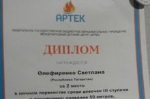 Поздравляем Олефиренко Светлану, ученицу 6 г класса, которая заняла 2 место в соревнованиях по плаванию в рамках Летнего фестиваля Всероссийского Физкультурно-спортивного комплекса ГТО среди школьников, который прошел в международном детском центре "Артек" с 18 октября по 8 ноября 2017 года. Так держать! Мы гордимся тобой!