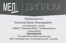 Поздравляем Хасанова Булата, ученика 5 А класса, с успешным участием в Республиканской олимпиаде МЕЛ. Булат стал призером олимпиады! Молодец!