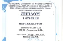Поздравляем ученика 6 В класса Балашова Владислава, классного руководителя Мякишеву Регину Ильгизовну и педагога-организатора Сайфуллину Наталью Ивановну, с победой в муниципальном конкурсе на лучшую разработку нового бренда республиканского союза детских организаций "Союз наследников Татарстана". Желаем успехов и новых побед!