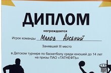 Малов Арсений, ученик 6 "Б" класса, очень любит баскетбол и занимается им уже несколько лет. На детском турнире по баскетболу среди юношей до 14 лет на призы ПАО «ТАТНЕФТЬ» Арсений и его команда заняли почетное 3 место. Ребята уже понимают, что спорт — это здоровье и важная часть жизни!